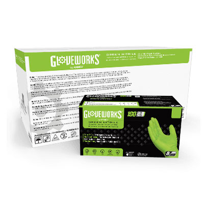 Gloveworks Industrial Green Nitrile Gloves stand up to the toughest jobs. They feature raised diamond texture (RDT) which creates 60% more surface area for an exceptional liquid channeling grip. RDT provides a comfortable fit: fewer contact points with the skin increase airflow and reduce sweating vs. non-textured gloves.